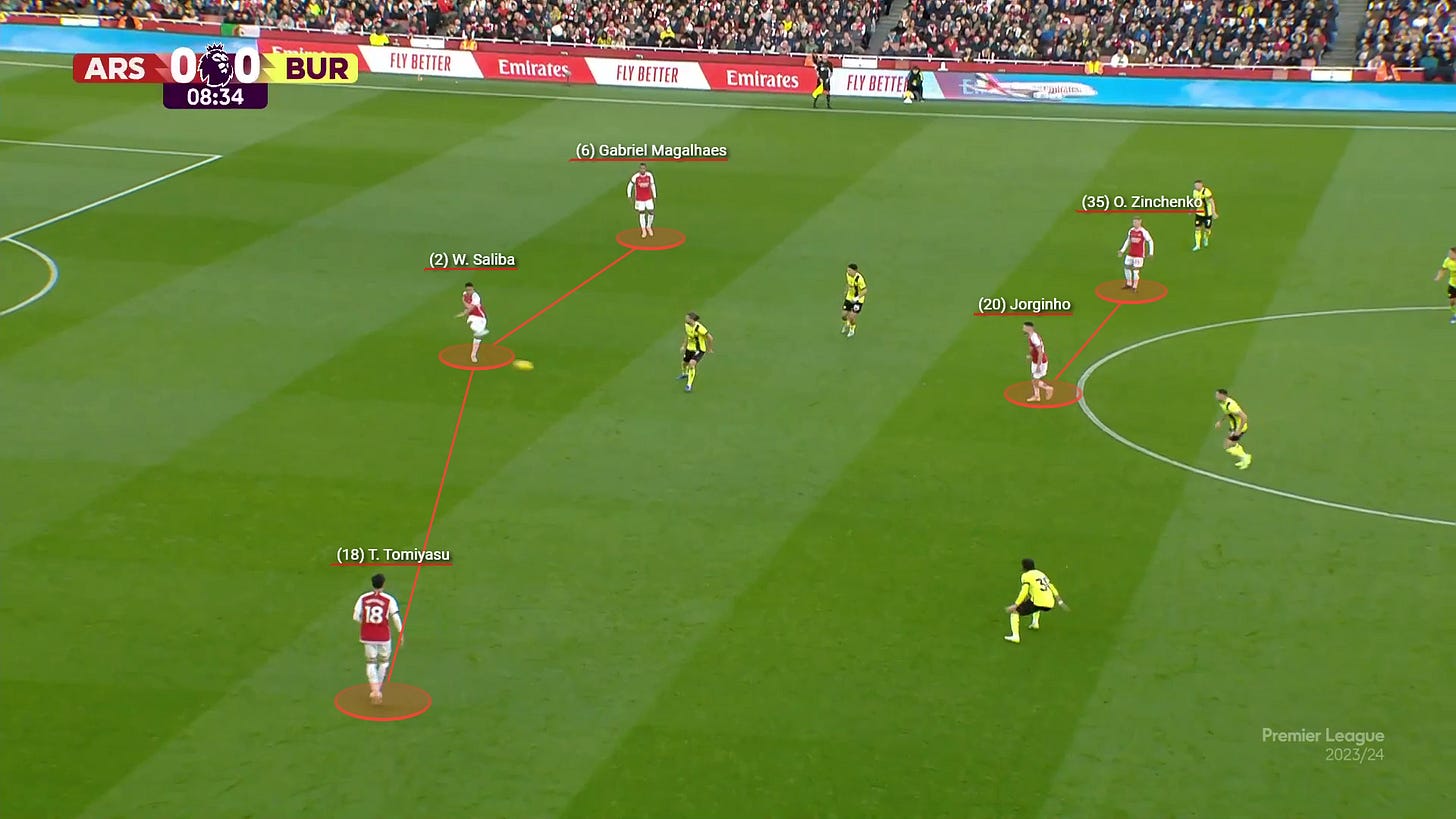 Mikel Arteta của Arsenal thường đảo ngược Zinchenko từ hậu vệ trái bên cạnh tiền vệ phòng ngự để có thể sử dụng khả năng chuyền bóng của cầu thủ người Ukraine để đưa bóng vào khu vực một phần ba cuối sân bằng những đường chuyền ngắn.