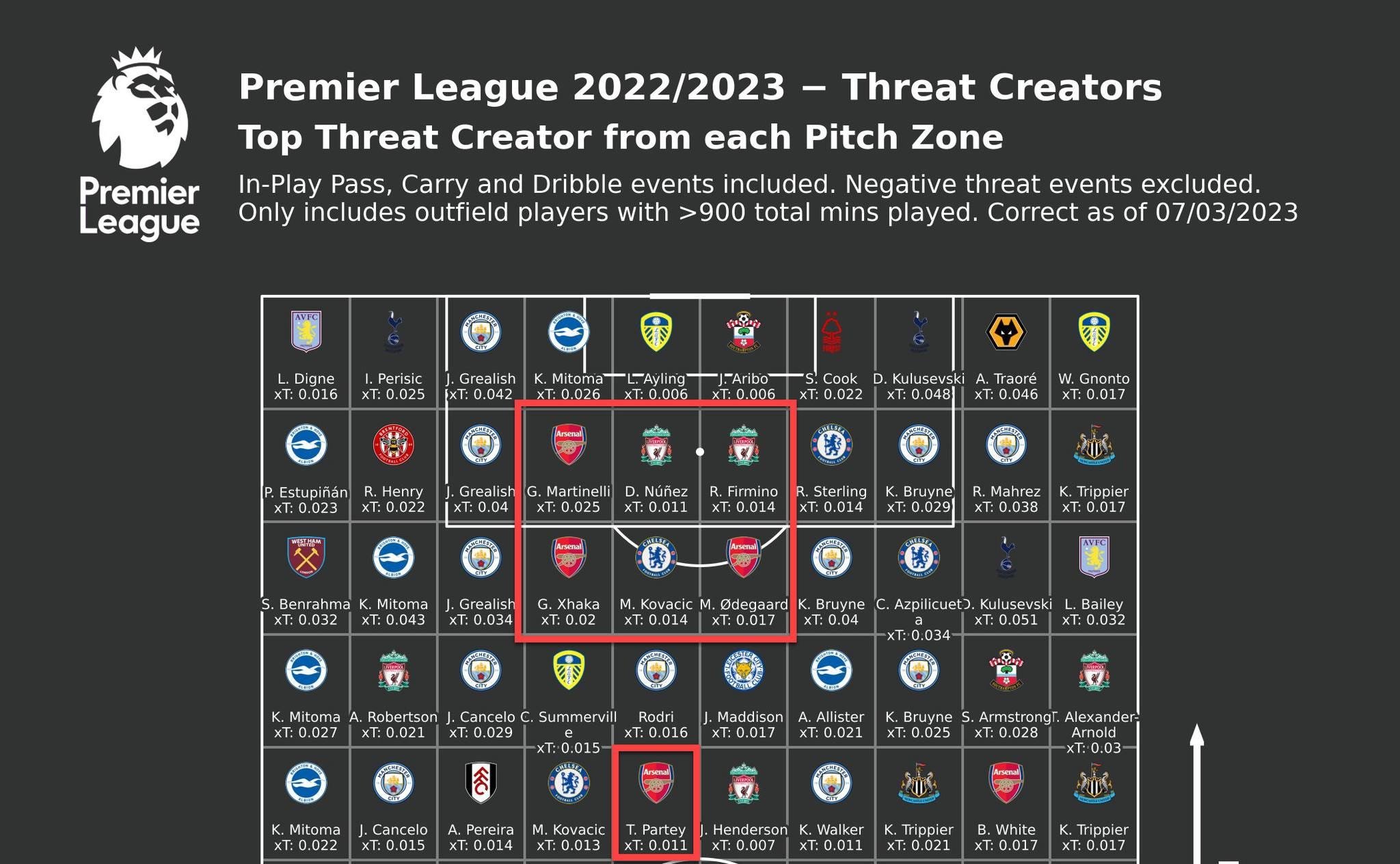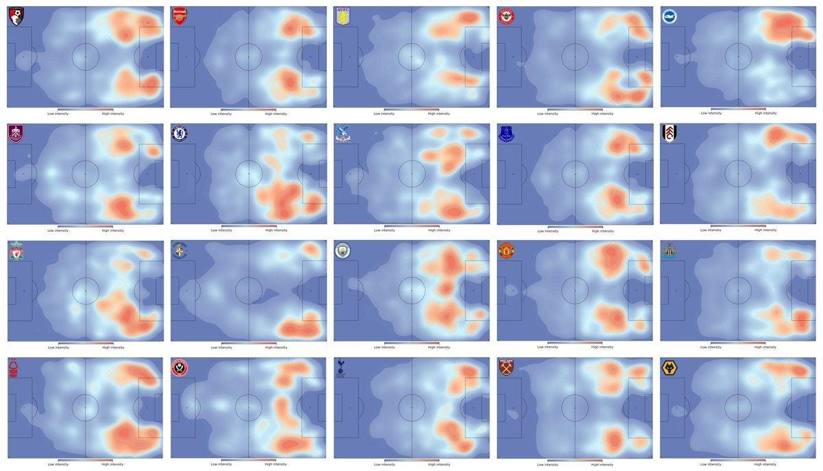 xT của Arsenal chủ yếu xuất hiện ở 2 cánh và half space, khác xa với xT của Arsenal mùa giải 22/23.