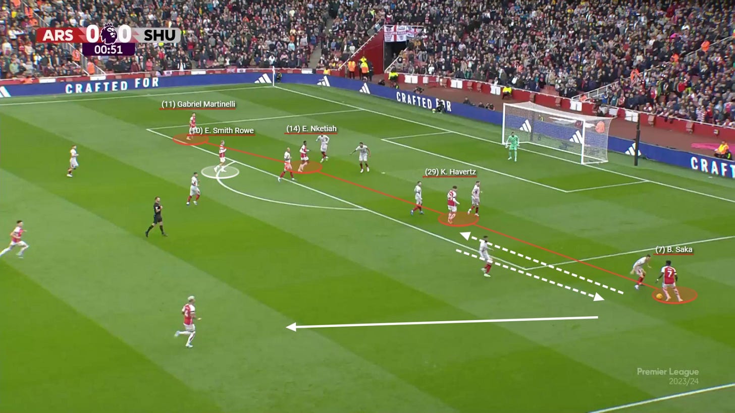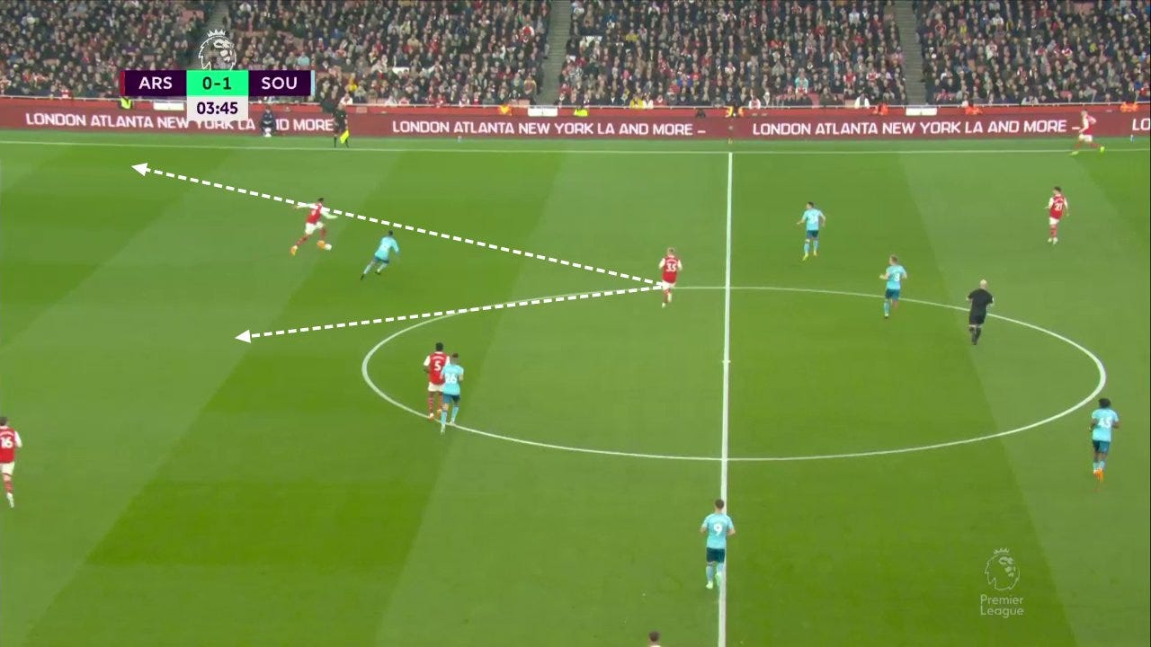 Cả hai trở thành những winger anti tempo , rê bóng rồi tạt hoặc chuyền về. Phương án duy nhất để Saka cắt vào trong là Ben White dâng cao để chồng cánh.