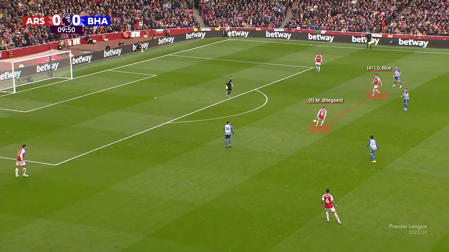 Chất lượng kỹ thuật của Odegaard không cần bàn cãi nhưng khi không có Partey, Odegaard phải tham gia nhiều hơn vào các vai trò sâu hơn để giúp Rice triển khai lối chơi khi Zinchenko chưa đảo ngược. Cựu tiền vệ West Ham rất tài năng nhưng chưa phát huy hết khả năng khi được yêu cầu đảm nhận quá nhiều trách nhiệm và cũng không phải là một người quá giỏi trong khả năng triển khai bóng.